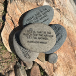 Etched onto a natural stone is the Frank Lloyd Wright quote, "I believe that in the search for the answer lies the answer" and "Frank Lloyd Wright"