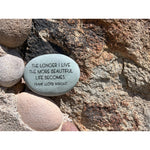 Etched onto a natural stone is the Frank Lloyd Wright quote, "The longer I live the more beautiful life becomes" and "Frank Lloyd Wright."