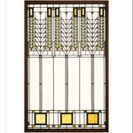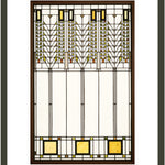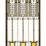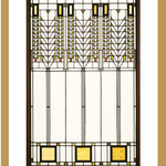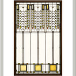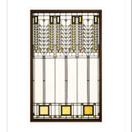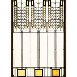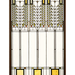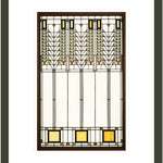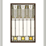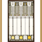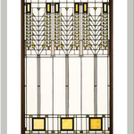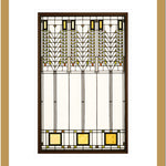 Darwin D. Martin House, 1903, Buffalo, NY. The Tree of Life is based on one of the 4,000 leaded art glass window and door designs featured prominently throughout the Darwin D. Martin House. Wright also created art glass designs for doors, skylights, back-lit ceiling panels, table lamps, and wall sconces. Wright’s geometric abstraction of the ancient tree of life symbol, using a square for the roots, straight lines for the trunk, and chevrons for the leaves.