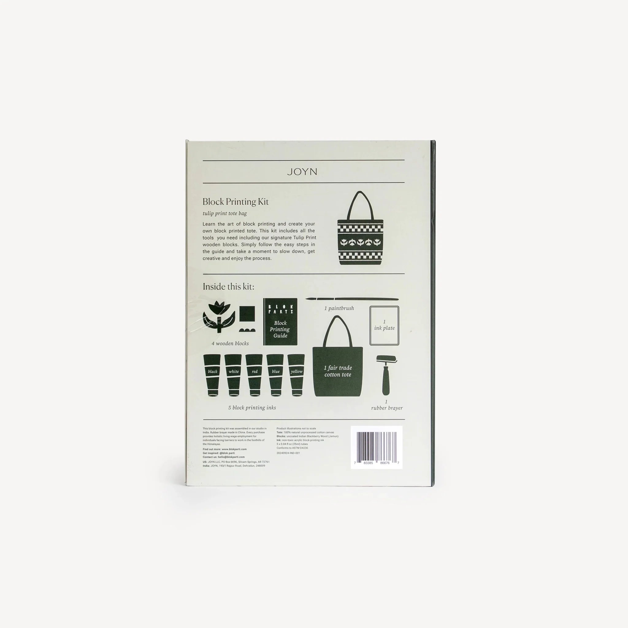 Inside this block printing kit, you'll find all the tools you need to learn the art of block printing, including hand-carved wooden blocks, five block printing inks, and a handcrafted tote bag. No experience necessary - simply follow the easy steps in the guide and take a moment to slow down, get creative and enjoy the process.