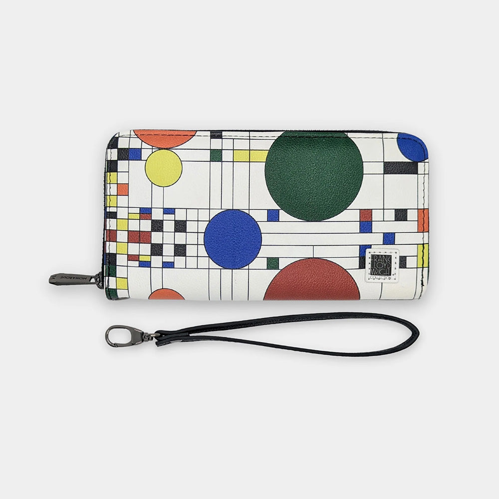 Inspired by art and nature with easy functionality. Made from textured vegan leather, this roomy wallet's fabric interior offers 7 different storage areas to give plenty of room for IDs, credit cards, receipts, or folded currency. Stay organized with 8 interior card slots, several slip pockets, and a zippered interior compartment. Most phones will easily fit inside, allowing a fashionable carry all. This wallet features a sturdy zipper and convenient removable wrist strap.