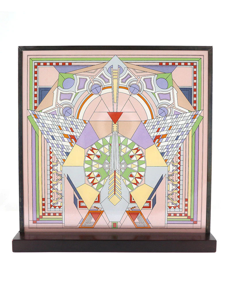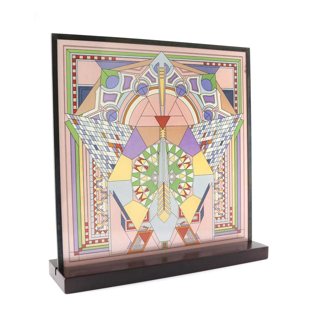 The Imperial Hotel Peacock Rug Art Glass is adapted from a peacock motif rug designed by Wright for the Imperial Hotel in Tokyo (1913-22, demolished in 1968), which depicts a geometric interpretation of the peacock, a motif repeated as a mural in "Peacock Alley", the hotel's lavish main lobby. On this glass panel, enamel colors are individually applied to a single sheet of glass which is then kiln fired to permanently fuse the enamels to the glass. The glass panel is then framed with a metal came and includes hanging chain and wood stand for optional desk or table display.
