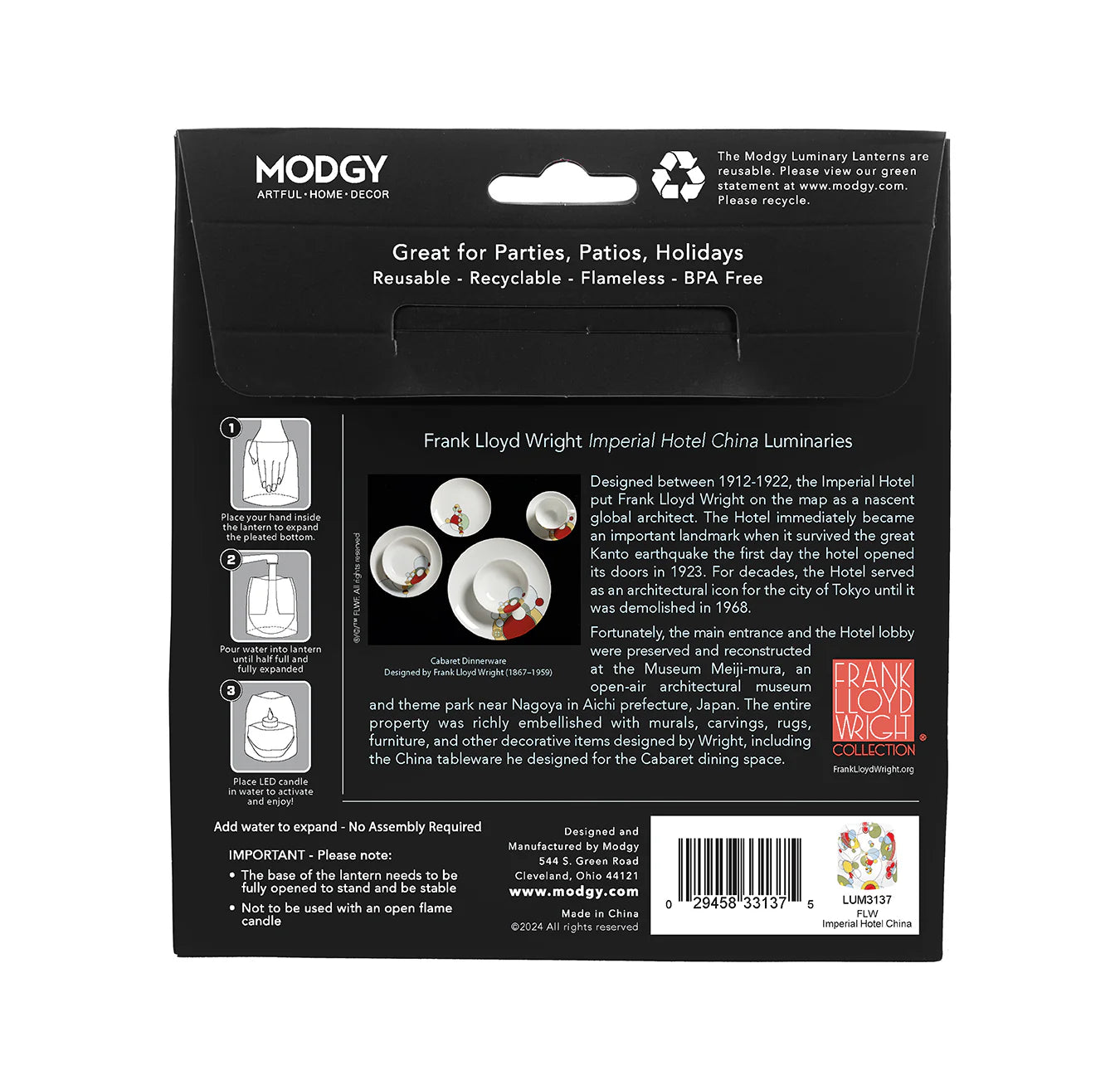 Gain an ethereal illumination indoors or out with this Frank Lloyd Wright Luminary. Simply add water and drop in flameless water-activated LED candles for a magical effect. Resilient and reusable, they easily expand for use and collapse for convenient storage.