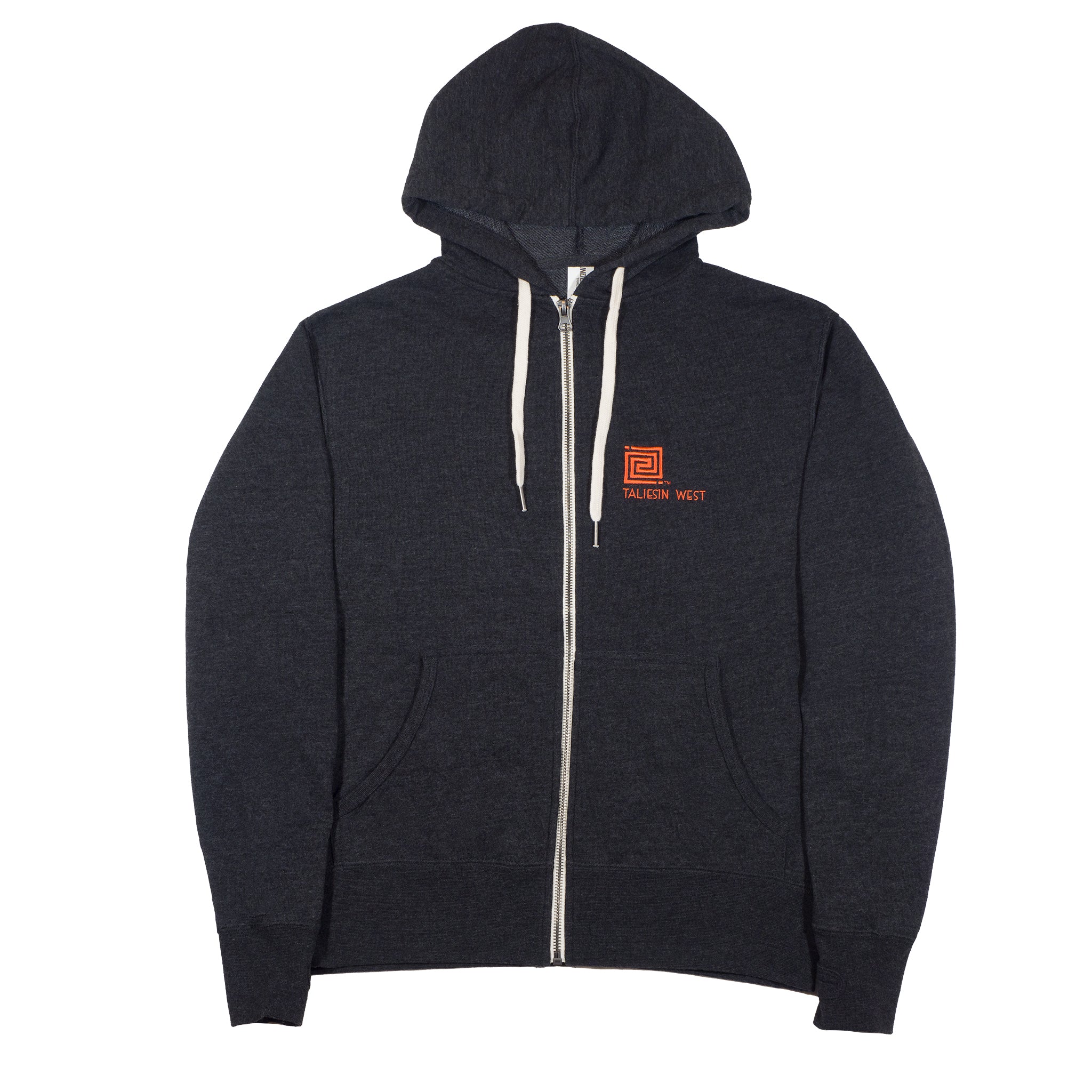 Features embroidered Whirling Arrow and "Taliesin West." Zippered front, two pockets, and hood with tie closure.