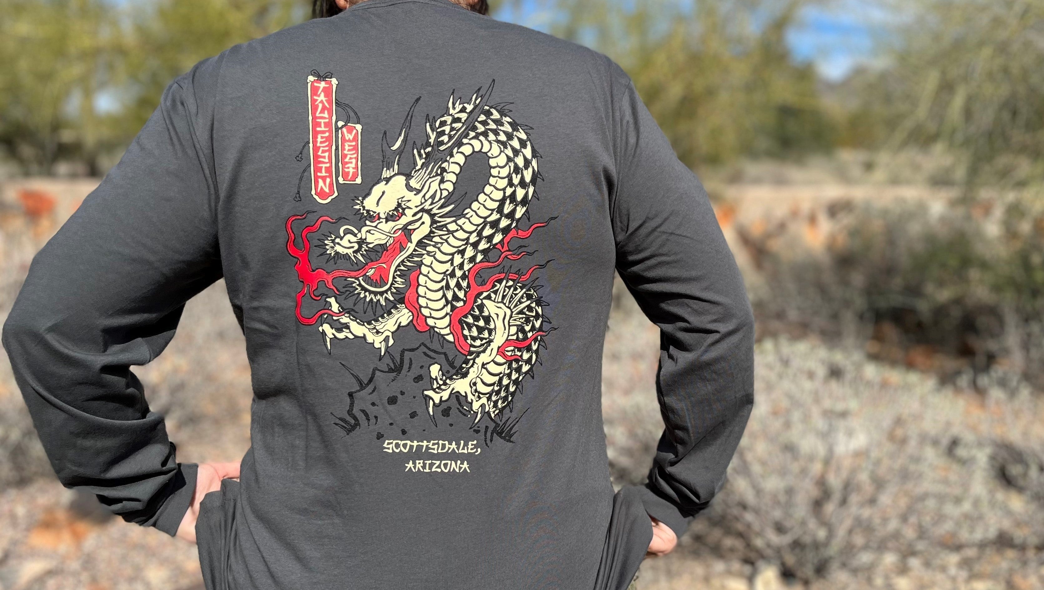 Scottsdale-based tattoo artist Josh Carter's interpretation our fire-breathing dragon is featured on the back. Front left chest features the whirling arrow, with Frank Lloyd Wright's signature on the sleeve.