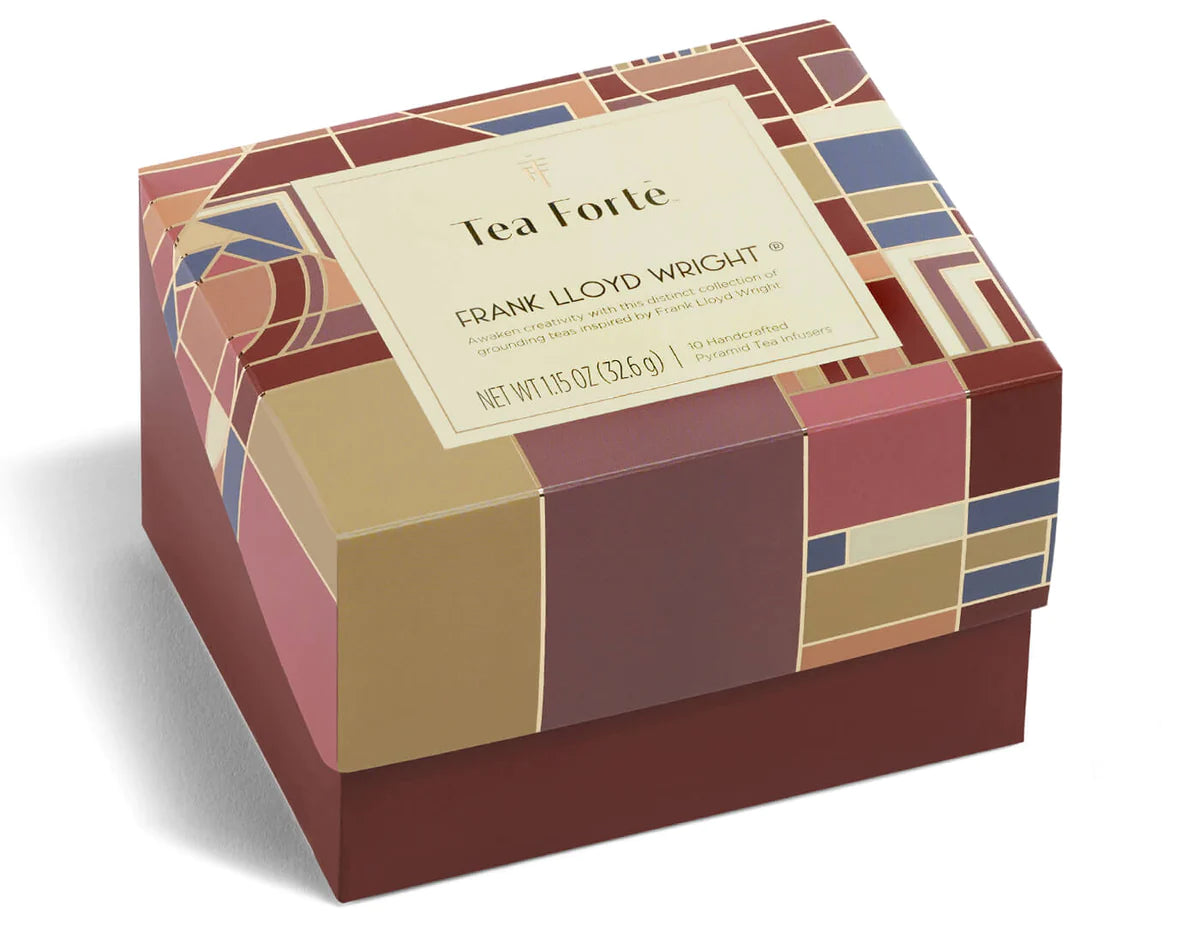 Tea Forte is delighted to introduce their exclusive collaboration with the Frank Lloyd Wright Foundation. Drawing inspiration from the legendary architect’s designs, the exclusive tea collection is wrapped in striking artwork that reflects his iconic style. Wright used earth’s geometry and simple, natural design to create beauty. The tea collection is rooted in the same vision, extending these principles to flavors and aromas so you may enjoy the essence in a cup.