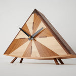 Pyramid clock made with lightly roasted maple in an alternating pattern make this beautiful mantel clock by Blackwell Woodworks. This clock is a recreation of 1950s era mid century Mauthe design. It looks beautiful in your bookcase or sitting proudly on your shelf, mantle, or wherever you display your fancy things.