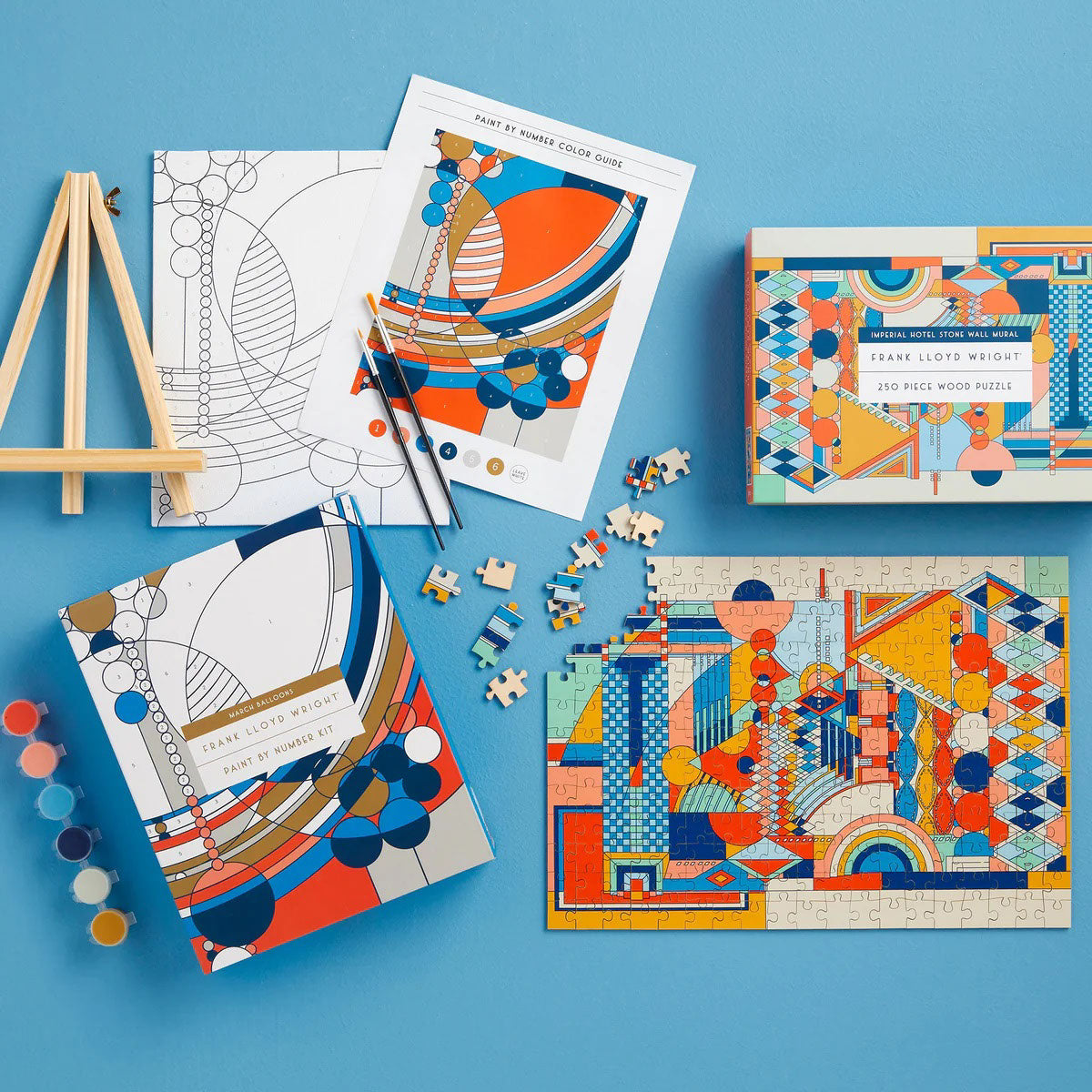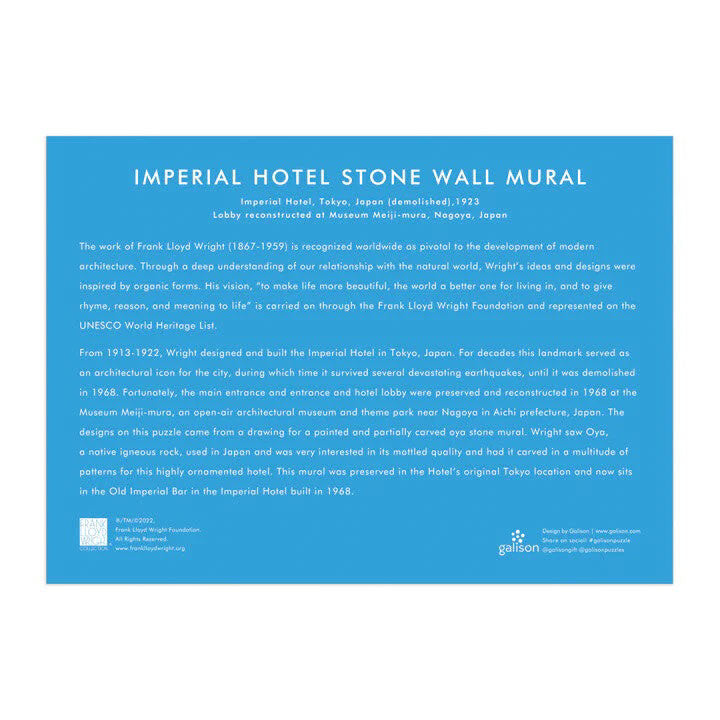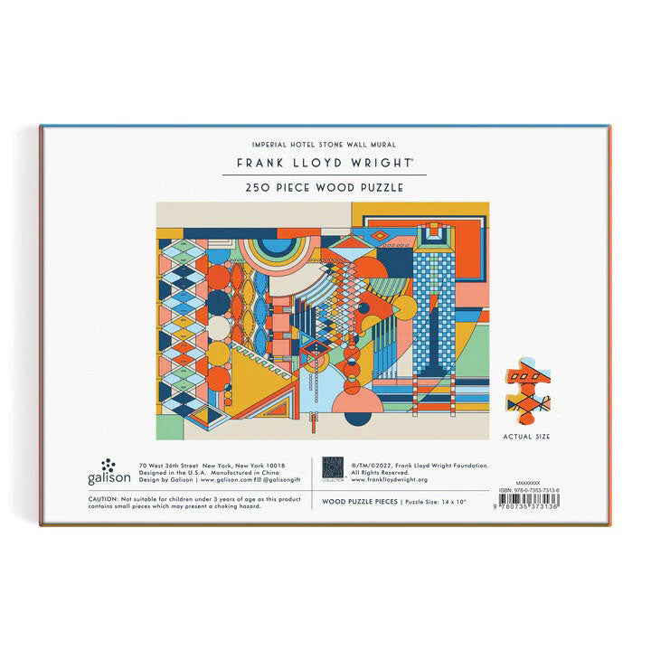 The Imperial Hotel Stone Wall Mural 250-Piece Wood Puzzle features the iconic artwork from the Frank Lloyd Wright Foundation. Galison puzzles are packaged in matte-finish sturdy boxes, perfect for gifting, reuse, and storage. An insert of the full puzzle image is also included.