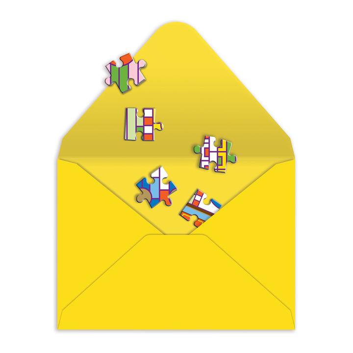 The Frank Lloyd Wright Saguaro Forms & Cactus Flowers Greeting Card Puzzle is a 60-piece postcard puzzle featuring Wright's colorful and iconic geometric design. The package comes with the puzzle fully assembled. Write the message on the back, break up the pieces, place in the envelope, and mail.