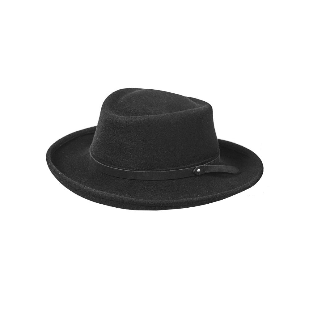 Make a statement with the Black Felt Gambler Hat, inspired by Frank Lloyd Wright's personal style. Crafted with a classic Gambler silhouette, the hat features a sleek black felt construction.