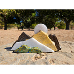 The stone used in these mountain sculptures is from around the world, all of it purchased from importers, miners, stone merchants, or individuals. Whenever possible, the Locke's buy the stone already cut into slabs to reduce waste and create in a higher quality product. The slabs are then cut, cleaned, "sculpted," and finished into individual mountains. All of the colors are natural colors as they came out of the earth. Some clear sealers are used to provide shine and strength.