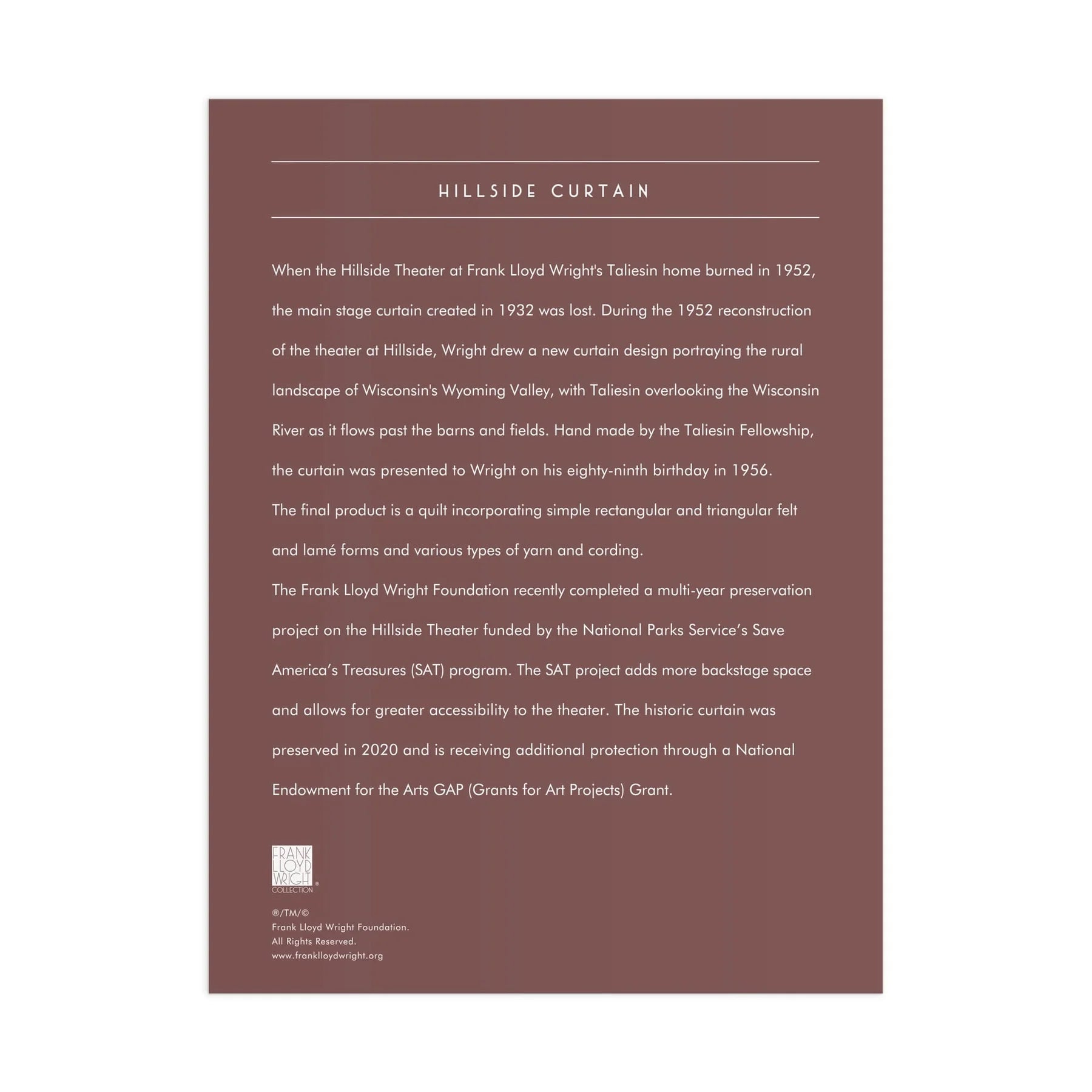 If for any reason you are not fully satisfied with your purchase, please email storesales@franklloydwright.org to make a return or exchange.