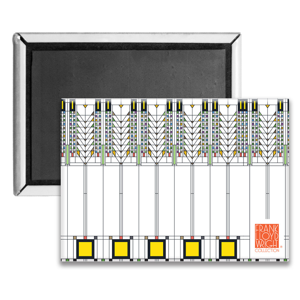Frank Lloyd Wright designed well over 4,000 leaded glass windows and doors for over 150 of his buildings. Wright also created art glass designs for doors, skylights, back-lit ceilings panels, table lamps, and wall sconces. The famed “Tree of Life” art glass pattern is found in several variations in Wright’s Darwin D. Martin House. The variation on this magnet is found on the central landing of the Martin House stairway.