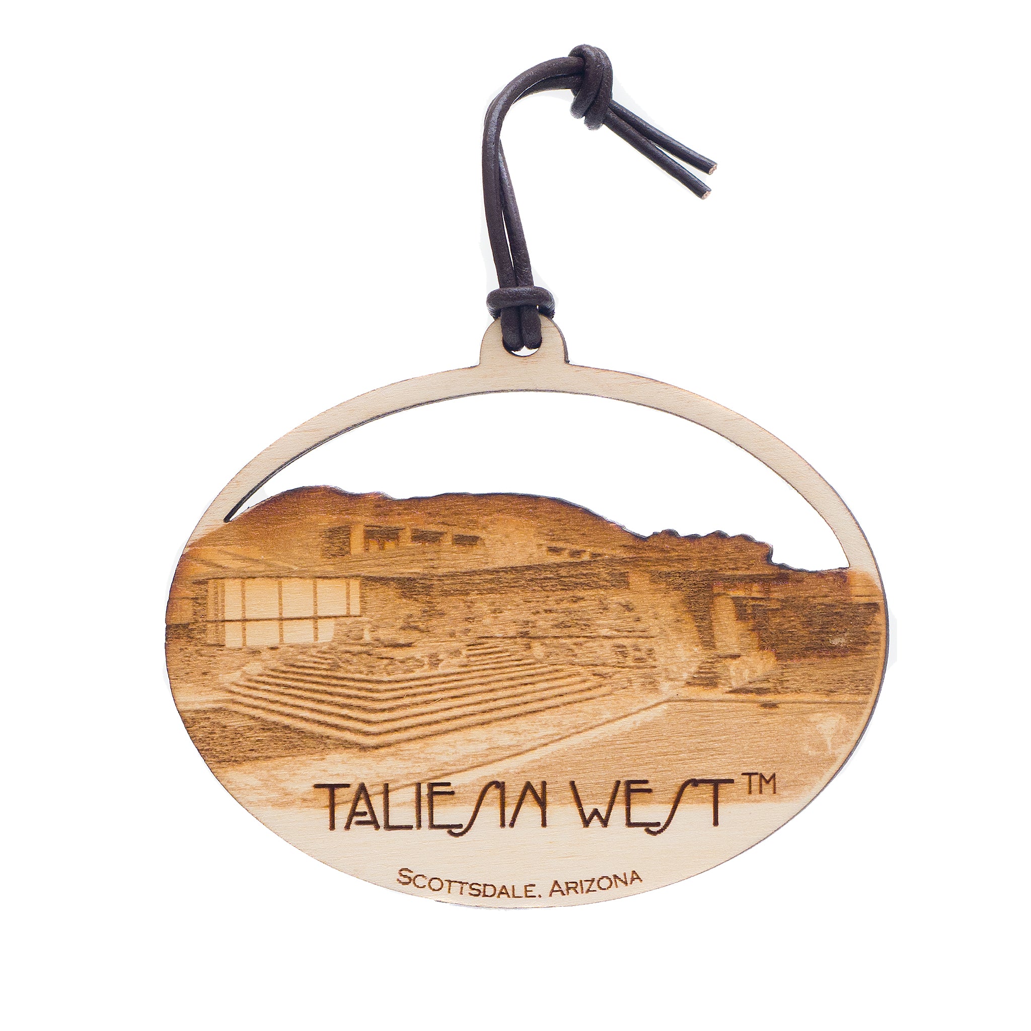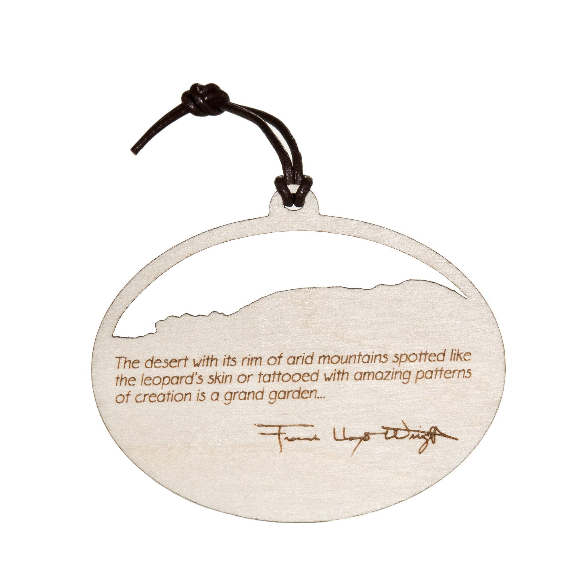 This custom wood ornament was created by Jodi Bombardier. The front features a view of Taliesin West from the prow and "Taliesin West." The back features Frank Lloyd Wright's signature and quote: "The desert with its rim of arid mountains spotted like the leopard's skin or tattooed with amazing patterns of creation is a grand garden..."