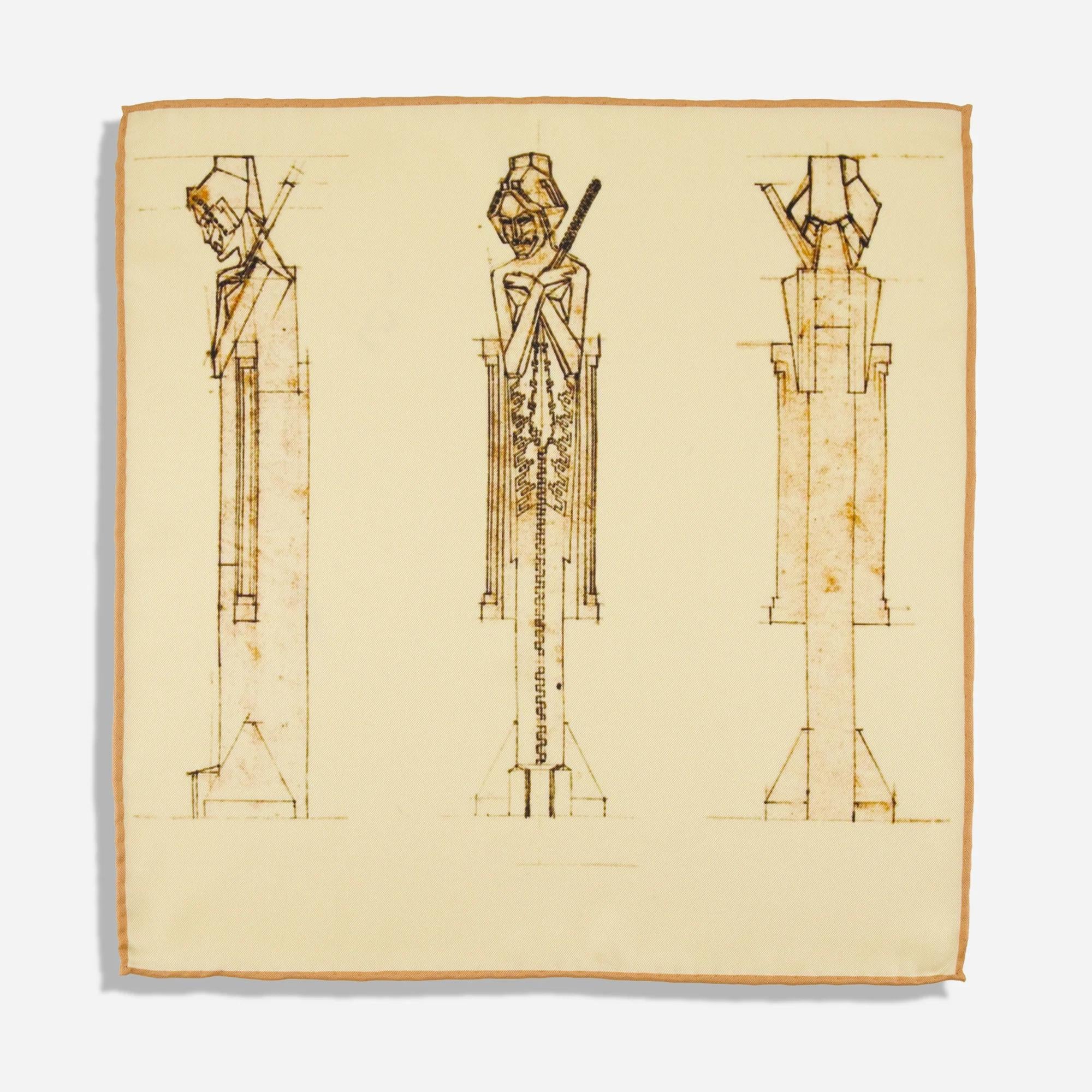 Sepia tones highlight Wright’s iconic Midway Gardens Sprites in this silk pocket square, blending sculptural artistry with refined detail.