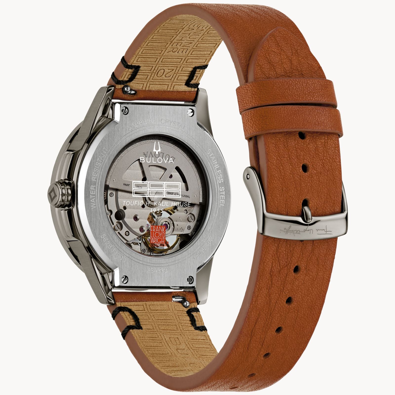 Infused with the essence of one of Frank Lloyd Wright's most distinct projects, this Bulova men's timepiece pays tribute to the Toufic H. Kalil house, one of the prolific architect's Usonian Automatic homes, built in 1955. Intricately patterned, the textured gray and green dial evokes the home and its forested surroundings while recreating its most eye-catching element, the modular block construction and multiple rows of rectangular windows. Freeform apertures in the dial reveal the automatic heartbeat movement beneath—especially fitting for the Kalil house's "Automatic" nickname. The gray ion-plated stainless steel case has a polished bezel and brushed finishing, a sapphire crystal, and features an exhibition case back printed with the house name and an image of the open blocks, along with the Frank Lloyd Wright logo. An exceptional timepiece for those with an eye for impeccable style and design, this Bulova men’s watch will be at home on any wrist.