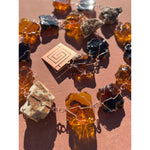 These rain chains are handmade with love by Teri Welsch of When Life Gives U Rocks, located in Arizona. Teri has created a version of her work for the Frank Lloyd Wright Store, using rocks that are similar to those found at Taliesin West. The glass used for each rain chain is known as Dalle de Verre, a thick stained glass used in most church windows. Each piece has been cut, chipped to create facets, lightly tumbled, and wire wrapped by Teri. These chains also feature a 100% Arizona copper Whirling Arrow fin attached the to the bottom of the chain.