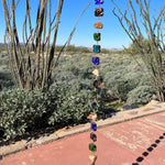 These rain chains are handmade with love by Teri Welsch of When Life Gives U Rocks, located in Arizona. Teri has created a version of her work for the Frank Lloyd Wright Store, using rocks that are similar to those found at Taliesin West. The glass used for each rain chain is known as Dalle de Verre, a thick stained glass used in most church windows. Each piece has been cut, chipped to create facets, lightly tumbled, and wire wrapped by Teri. These chains also feature a 100% Arizona copper Whirling Arrow fin attached the to the bottom of the chain.