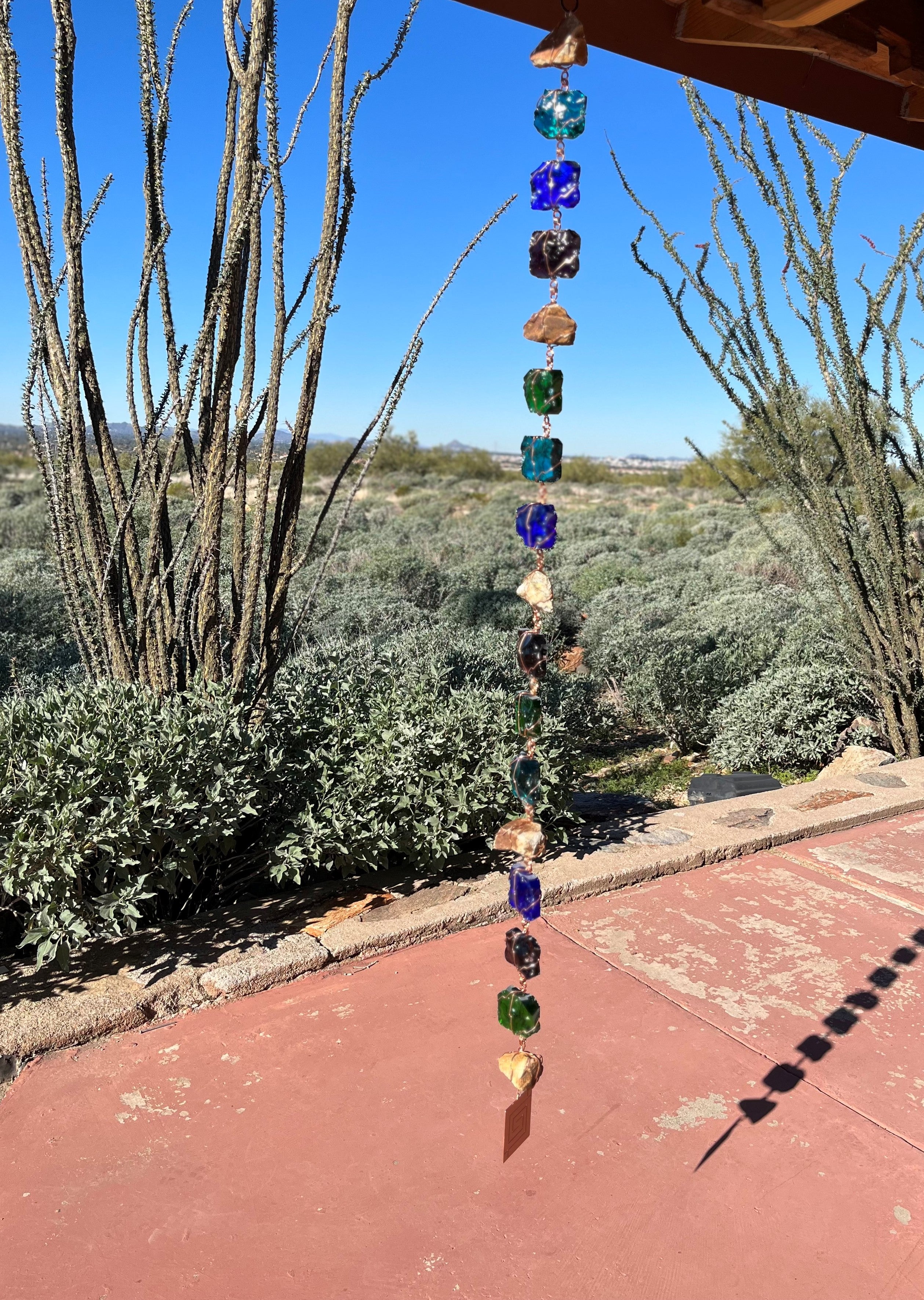 These rain chains are handmade with love by Teri Welsch of When Life Gives U Rocks, located in Arizona. Teri has created a version of her work for the Frank Lloyd Wright Store, using rocks that are similar to those found at Taliesin West. The glass used for each rain chain is known as Dalle de Verre, a thick stained glass used in most church windows. Each piece has been cut, chipped to create facets, lightly tumbled, and wire wrapped by Teri. These chains also feature a 100% Arizona copper Whirling Arrow fin attached the to the bottom of the chain.