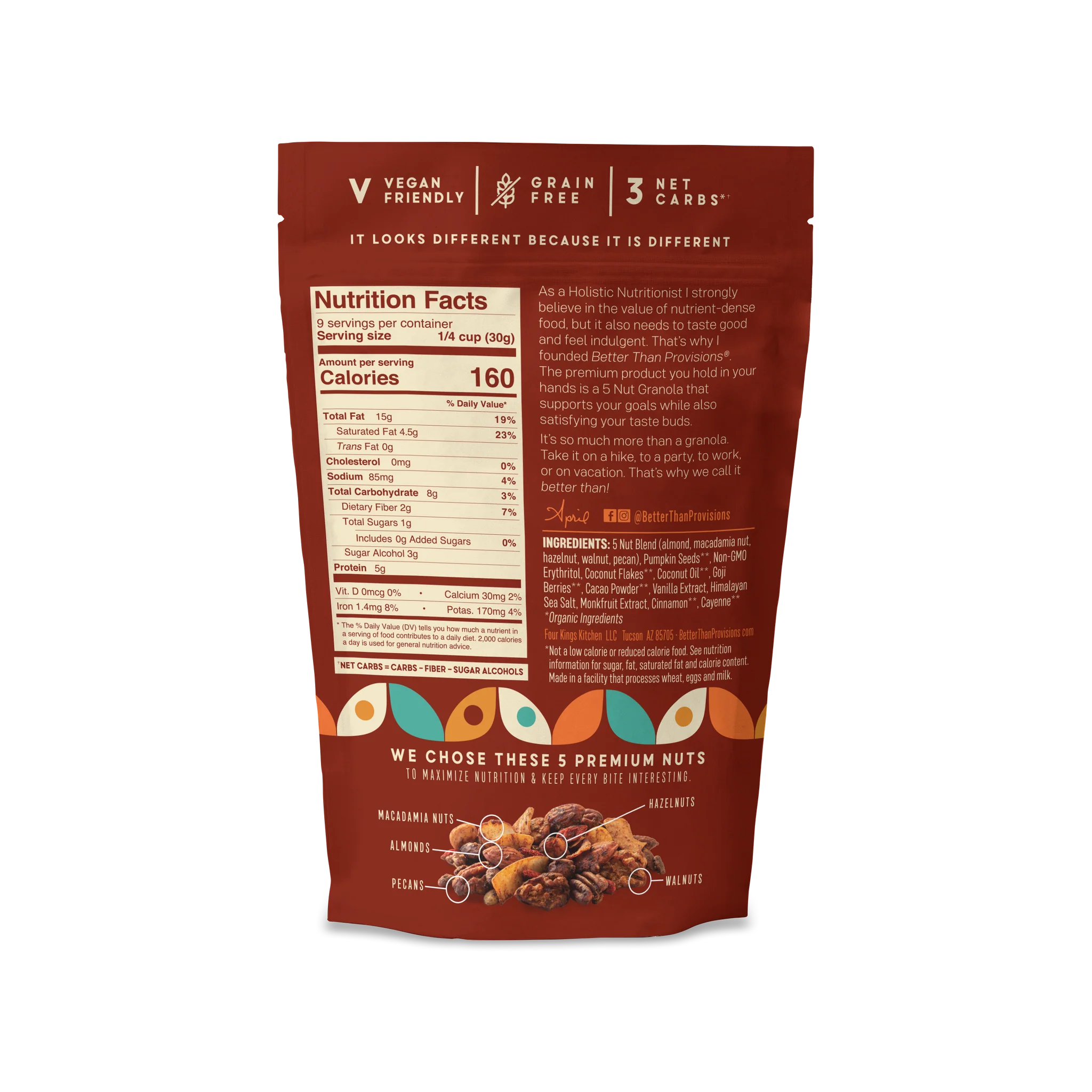 Nothing is held back with this flavor - it's packed with decadent cacao, superfood goji berries, and hot cayenne. It works perfect by the handful as a snack or as a salad topping - it adds great flavor and crunch in place of croutons!