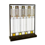 This Tree of Life stained art glass pattern is found in several variations in Frank Lloyd Wright's Darwin D. Martin House. The four-pot variation is found on the central landing of the Martin House stairway. This exquisite adaptation of the Tree of Life stained glass window is framed with a copper patina frame for an antique feel and is perfect for desktop display or hanging. On this glass panel, enamel colors are individually applied to a single sheet of glass which is then kiln fired to permanently fuse the enamels to the glass. The glass panel is then framed with a metal came and includes hanging chain and wood stand for optional desk or table display.