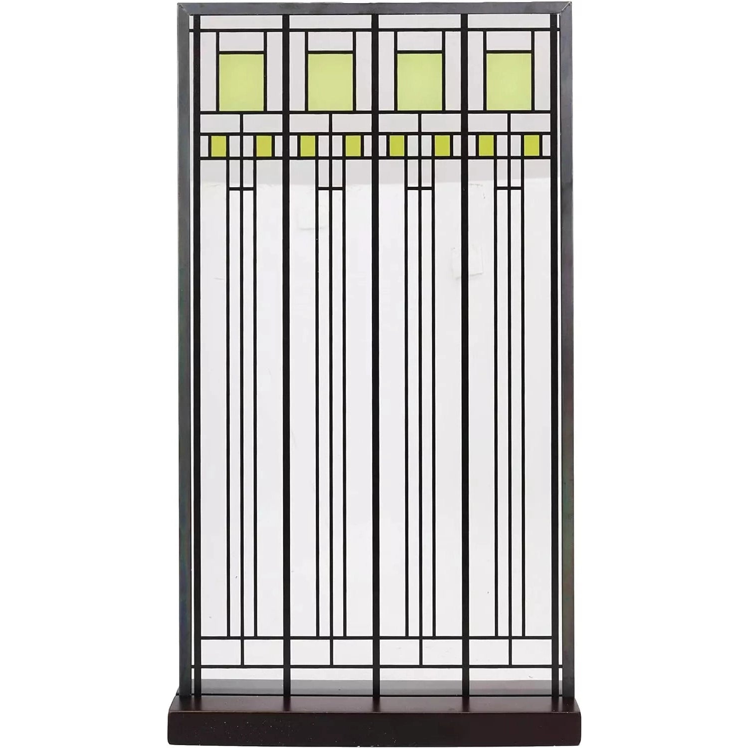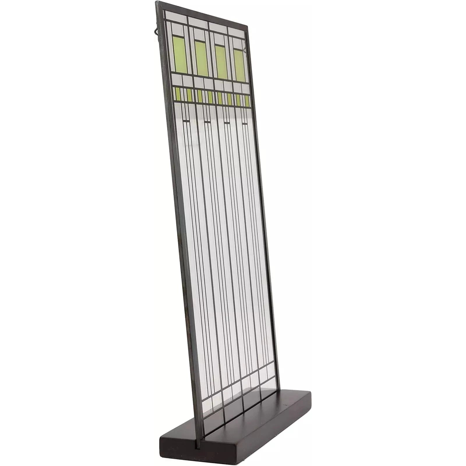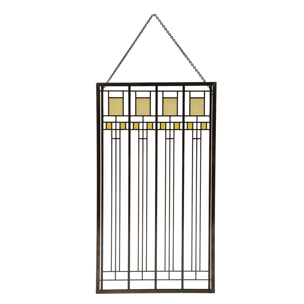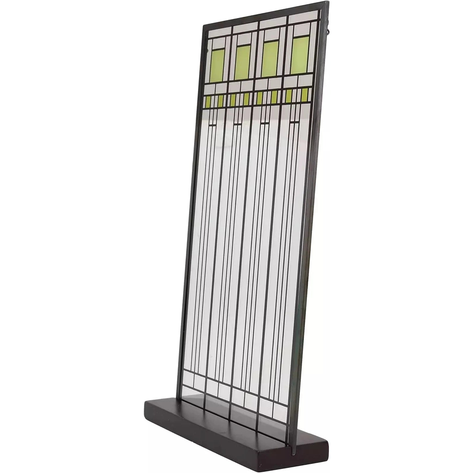 The Oak Park Home & Studio Playroom Window Art Glass is adapted from Frank Lloyd Wright's home in Oak Park, Illinois. This window is found in the playroom's art glass bay windows. The transparency of the rectangles and squares as well as the abstracted flowers and leaves reflect the real ones outdoors. On this glass panel, enamel colors are individually applied to a single sheet of glass, which is then kiln fired to permanently fuse the enamels to the glass. The glass panel is then framed with a metal came and includes hanging chain and wood stand for desk or table display.