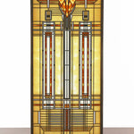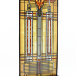 The Frank Lloyd Wright Bradley House Skylight Stained Glass is adapted from the dining room ceiling of the B. Harley Bradley House (Kankakee, Illinois, 1900), which is widely recognized as Wright's first Prairie Style design. This stained glass panel has been developed in association with the Frank Lloyd Wright Foundation. On this glass panel, enamel colors are individually applied to a single sheet of glass which is then kiln fired to permanently fuse the enamels to the glass. The glass panel is then framed with a metal came and includes hanging chain and wood stand for desk or table display.