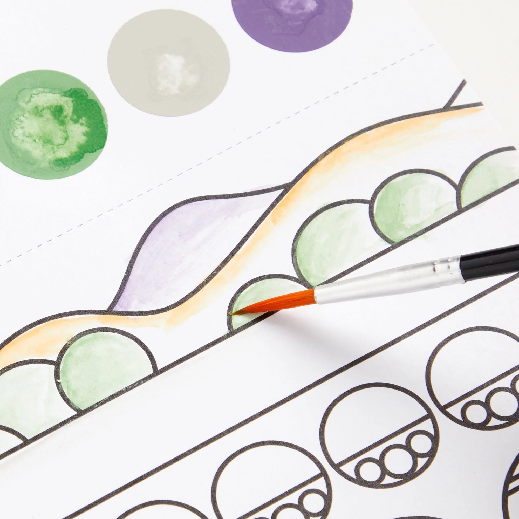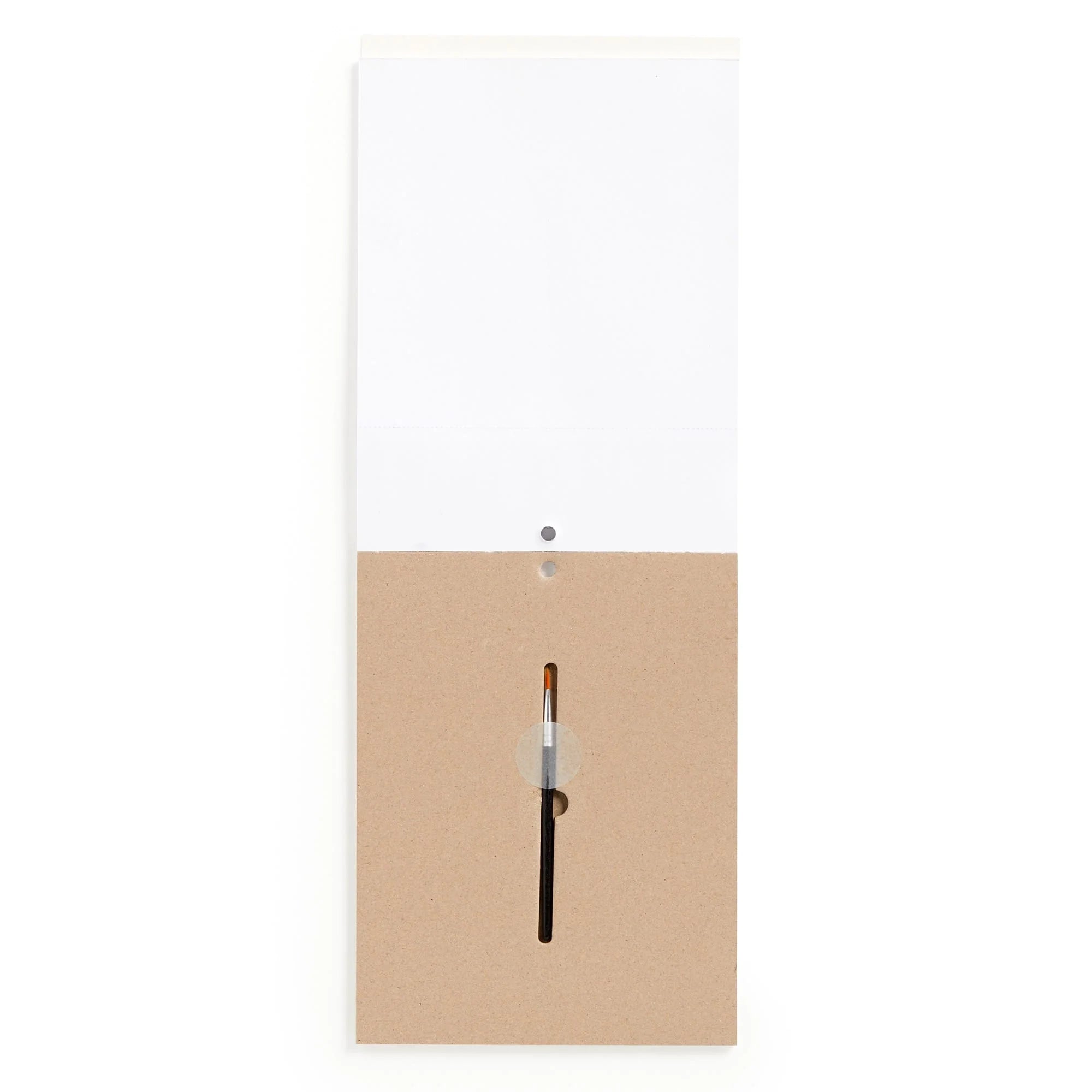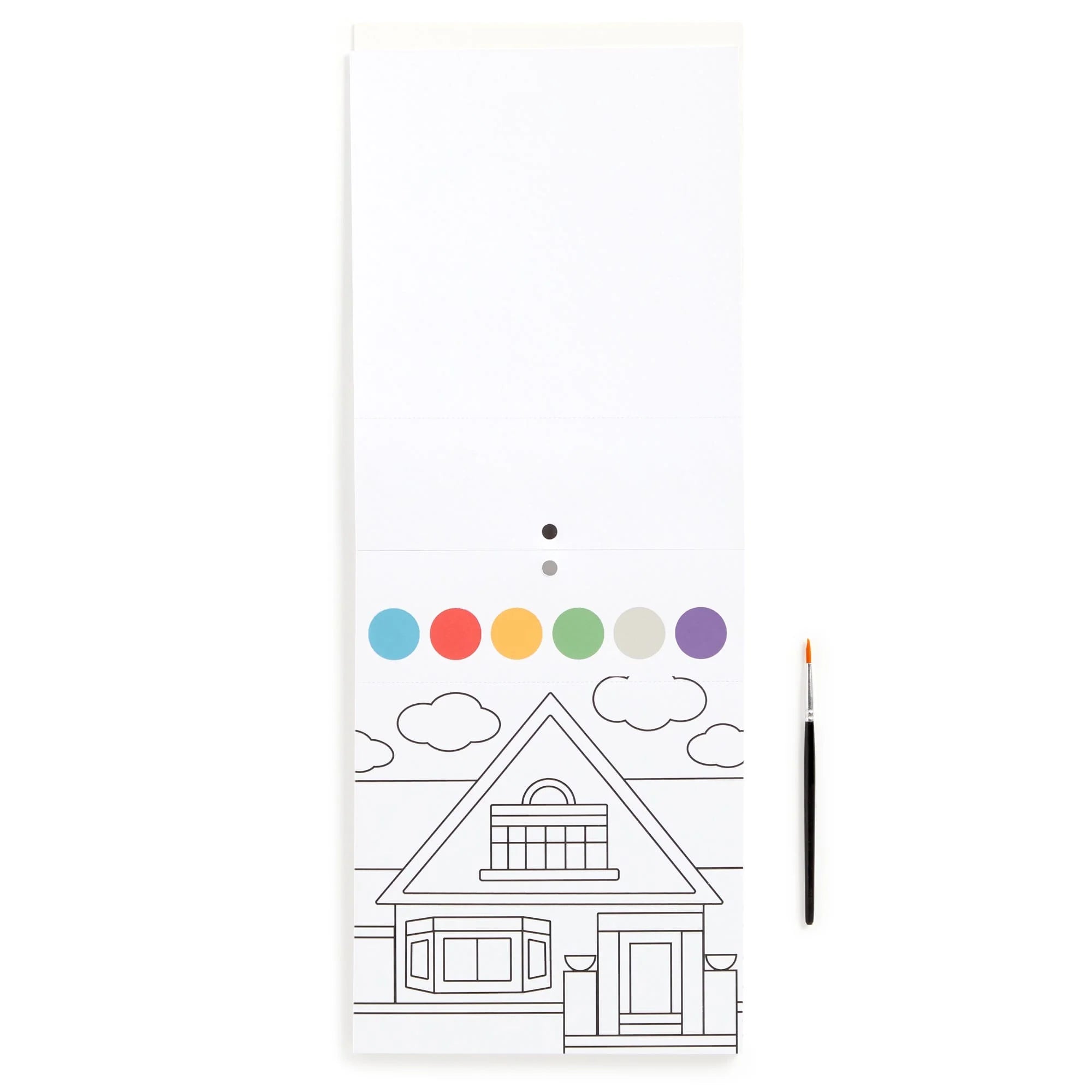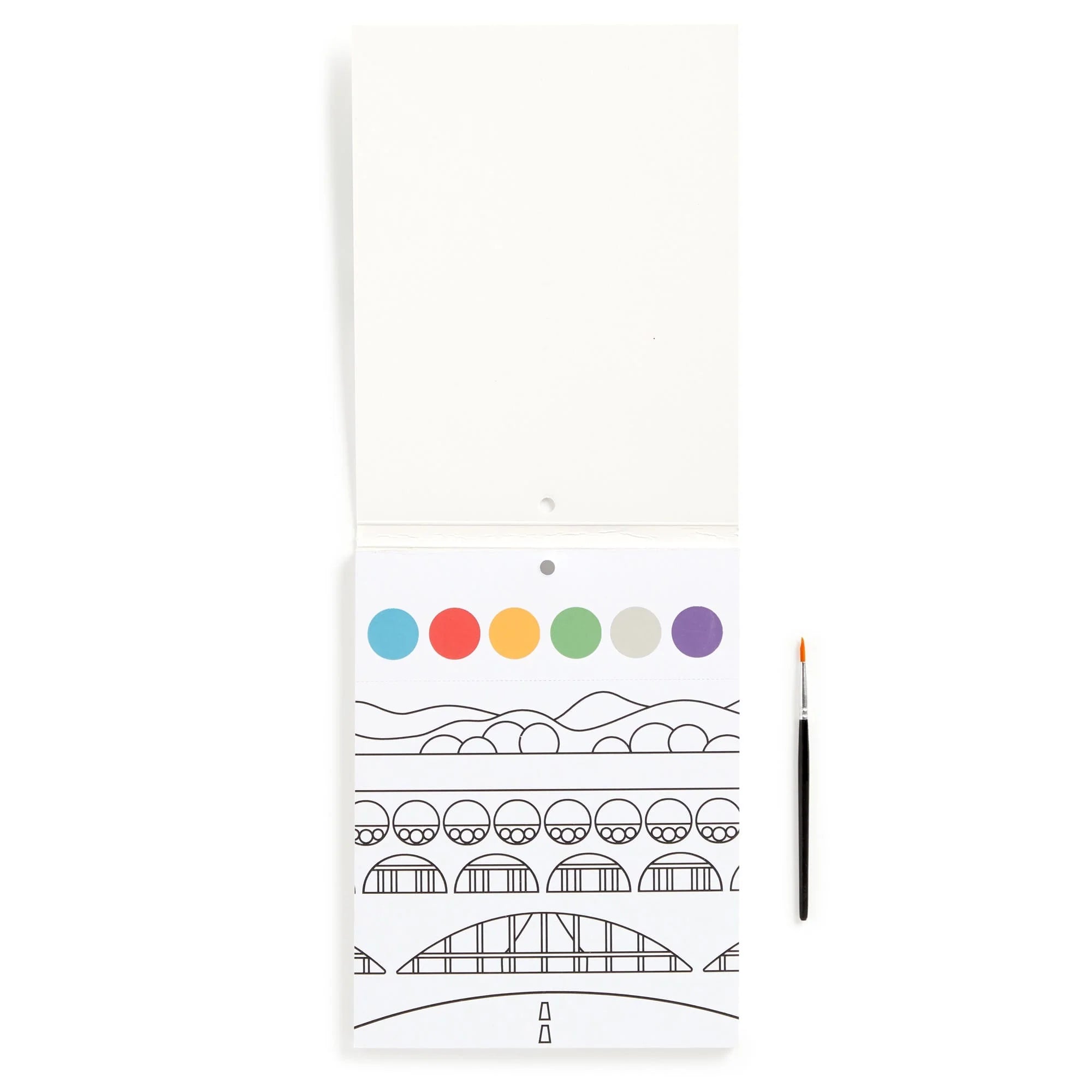The Frank Lloyd Wright Painting Kit includes 10 paintable cards each with a unique geometric pattern illustration, as well as a built-in watercolor paint palette at the top of each card, and a watercolor brush which is neatly packaged in place with a cardboard insert at the back of the pad. Dip the brush in water, apply to the paint palette to activate the colors, and paint your masterpiece! A perforated edge allows for the finished artwork to be separated from the paint palette for easy display.