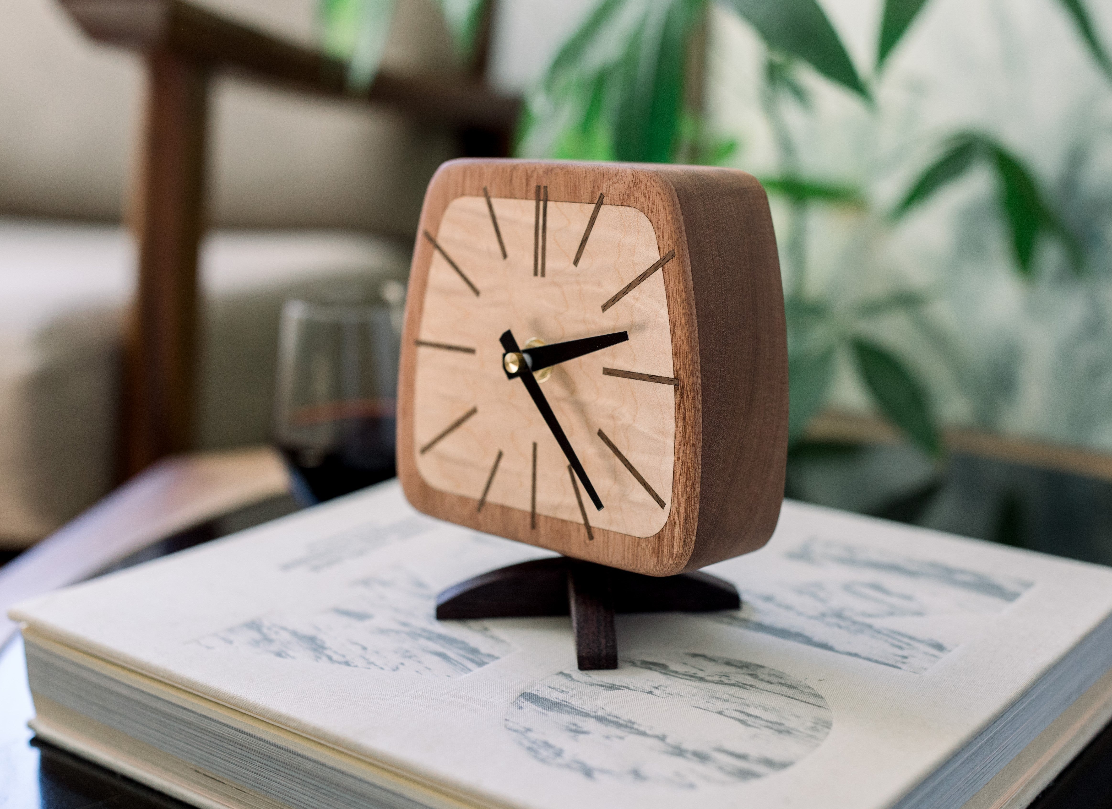 This Mid Century inspired table clock by Blackwell Woodworks is a must-have for any fan of retro design. Inspired by classic car interiors, this sleek and stylish clock is sure to turn heads. The body is made from mahogany with a figured maple face, while the pedestal is handmade from solid rosewood in the shape of a cross. Each clock is meticulously carved, cut, and precisely assembled as a piece of functional art at the Blackwell Woodworks Los Angeles workshop. The motor inside is a long lasting, durable quartz movement. It looks beautiful in your bookcase or sitting proudly on your shelf, mantle, or wherever you display your fancy things.