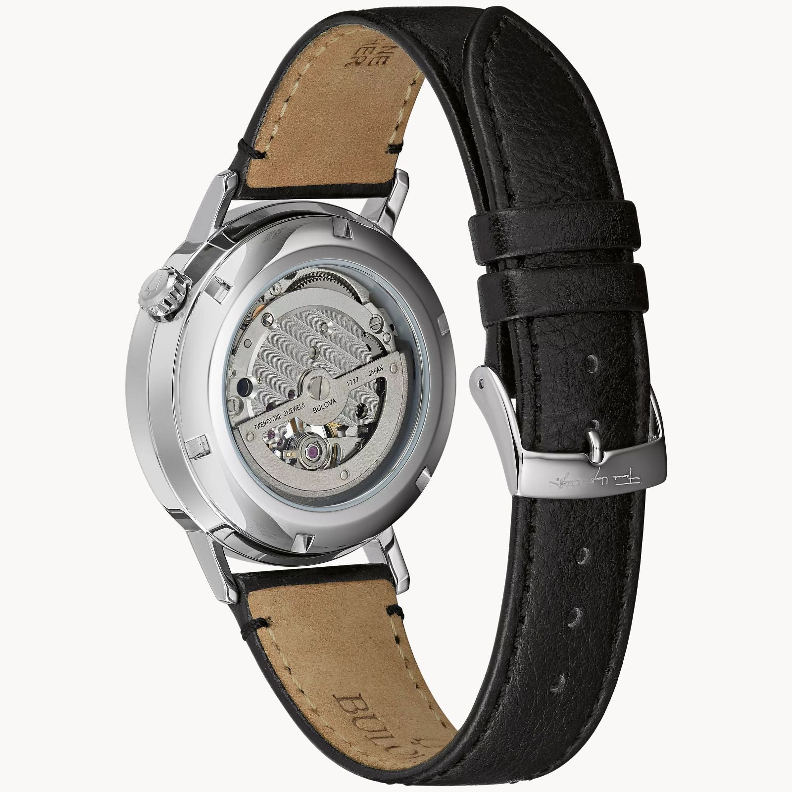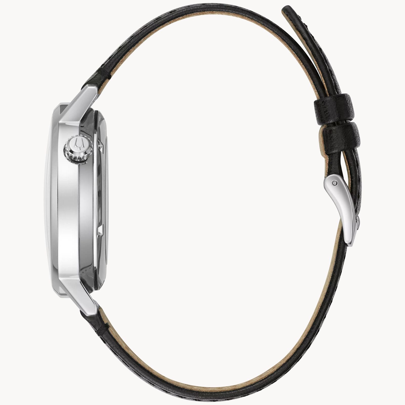 ⋅Strap: Black leather strap with 3-piece buckle closure