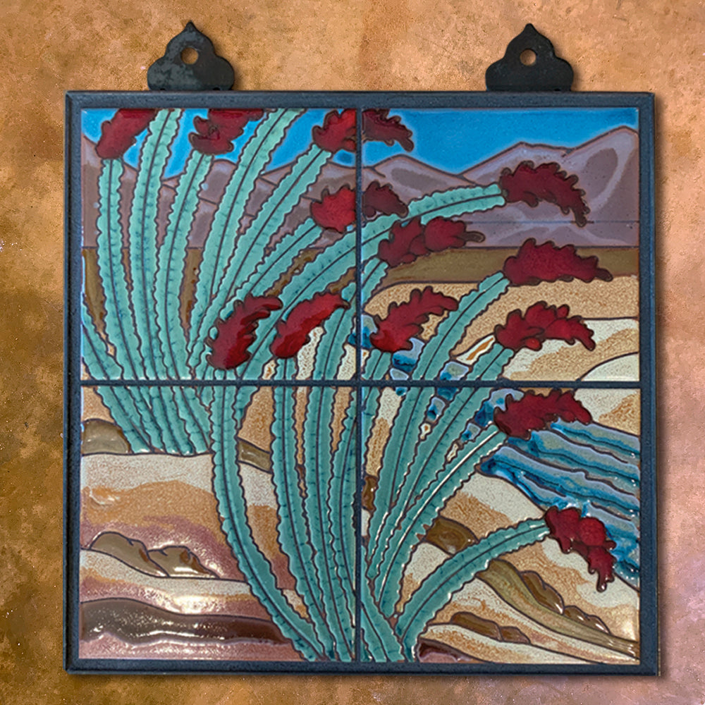 These hand-glazed tiles have been set and grouted into a sealed metal frame.