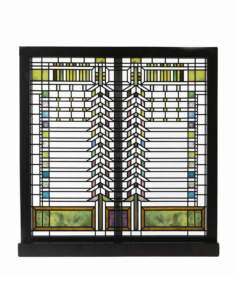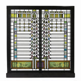 The Darwin D. Martin Casement Window Art Glass is adapted from an art glass window in the Darwin D. Martin House (Buffalo NY 1903-1905). The Martin House complex has more art glass in more patterns than any other house designed by Frank Lloyd Wright, with nearly four hundred examples of Wright-designed art glass, including the famous "Tree of Life" window. On this glass panel, enamel colors are individually applied to a single sheet of glass which is then kiln fired to permanently fuse the enamels to the glass. The glass is then wood framed with matching stand.