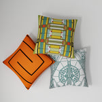 This pillow is inspired by Frank Lloyd Wright's designs of the Imperial Hotel in Tokyo, Japan. He began working on this project in 1913 and the completed hotel opened in 1923. The landmark served as an architectural icon for decades, during which time it survived several earthquakes until its demolition in 1968. Fortunately, the main entrance and hotel lobby were preserved and reconstructed in 1968 at the Museum Meji-mura, in Japan.