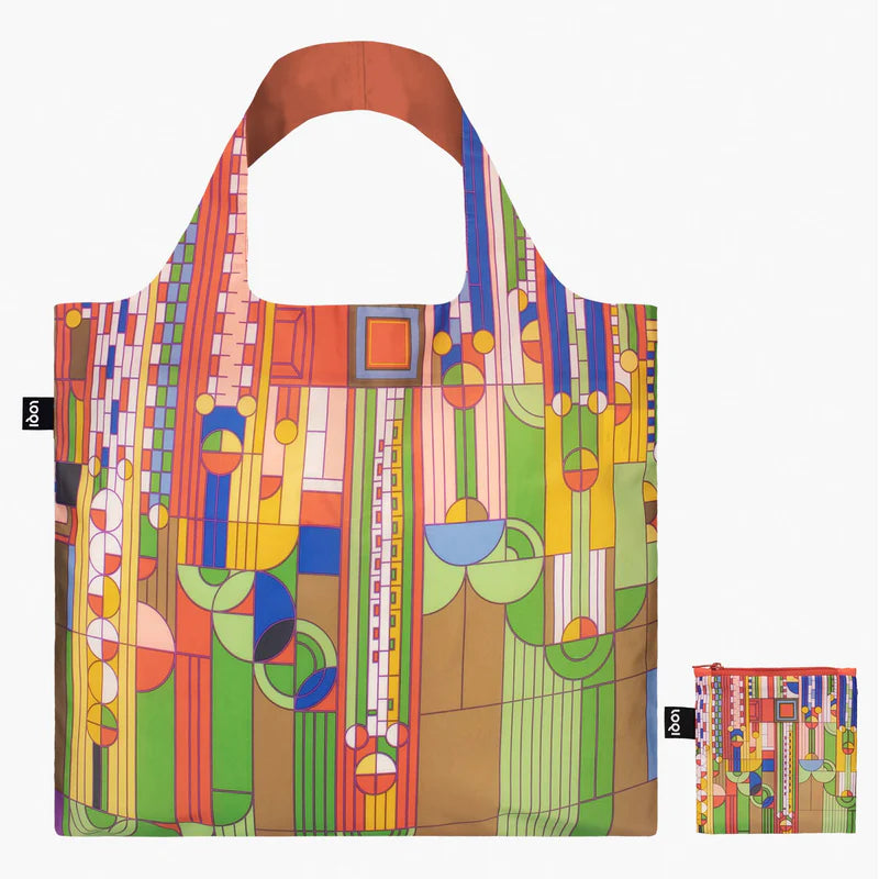 This recycled bag features a design based on Frank Lloyd Wright's "Saguaro Forms and Cactus Flowers." In 1927, Wright designed a series of twelve seasonally themed monthly covers for Liberty magazine. Wright’s interpretation of a desert landscape, although initially disregarded, became one of his most popular and was later transformed into a stained-glass feature for the lobby of the renowned Arizona Biltmore hotel.