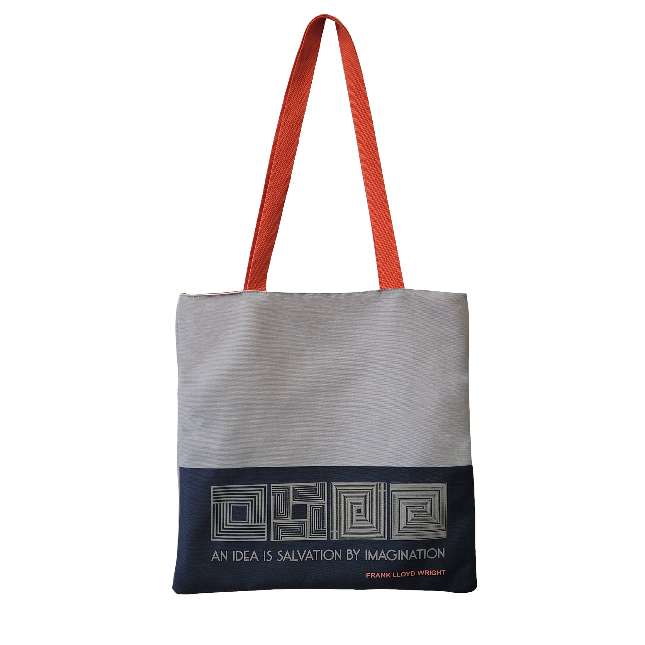 This tote features four different Whirling Arrow designs, showcasing the the progression of the symbol. The ancient Hohokam petroglyph that inspired this design was found on a boulder amongst the over 600 acres Taliesin West, Wright’s winter estate, studio, and school located in Scottsdale, AZ. Wright had stated that it reminded him of two hands clasping in a gesture of friendship.