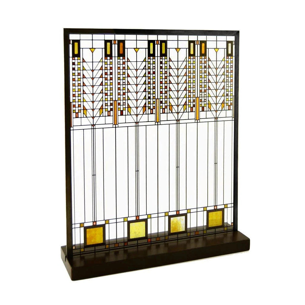 This Tree of Life stained art glass pattern is found in several variations in Frank Lloyd Wright's Darwin D. Martin House. The four-pot variation is found on the central landing of the Martin House stairway. This exquisite adaptation of the Tree of Life stained glass window is framed with a copper patina frame for an antique feel and is perfect for desktop display or hanging. On this glass panel, enamel colors are individually applied to a single sheet of glass which is then kiln fired to permanently fuse the enamels to the glass. The glass panel is then framed with a metal came and includes hanging chain and wood stand for optional desk or table display.
