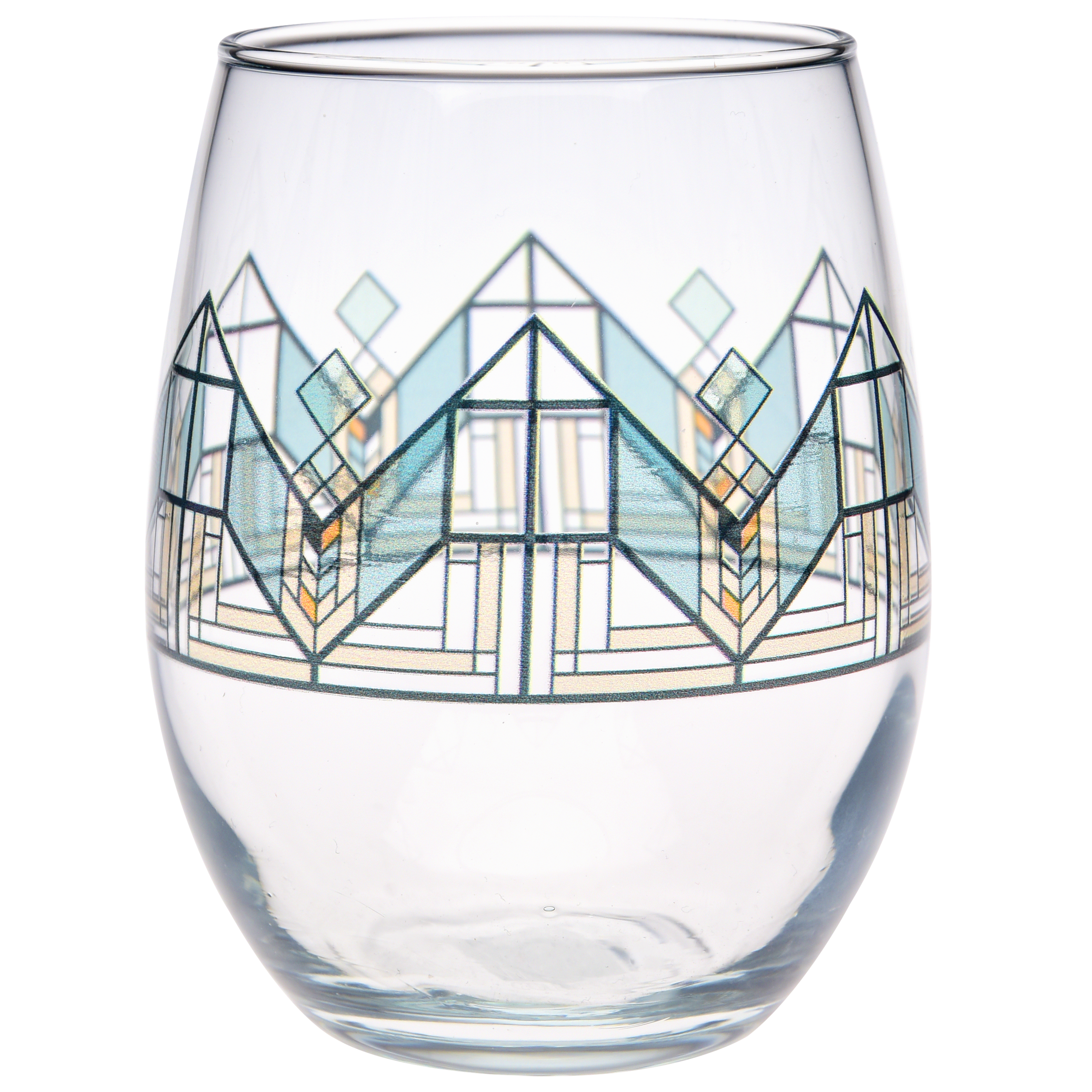 Enjoy your favorite drink in this classic Frank Lloyd Wright inspired Stemless Wine glass, featuring a design motif from a resort hotel overlooking Lake Geneva in Wisconsin.