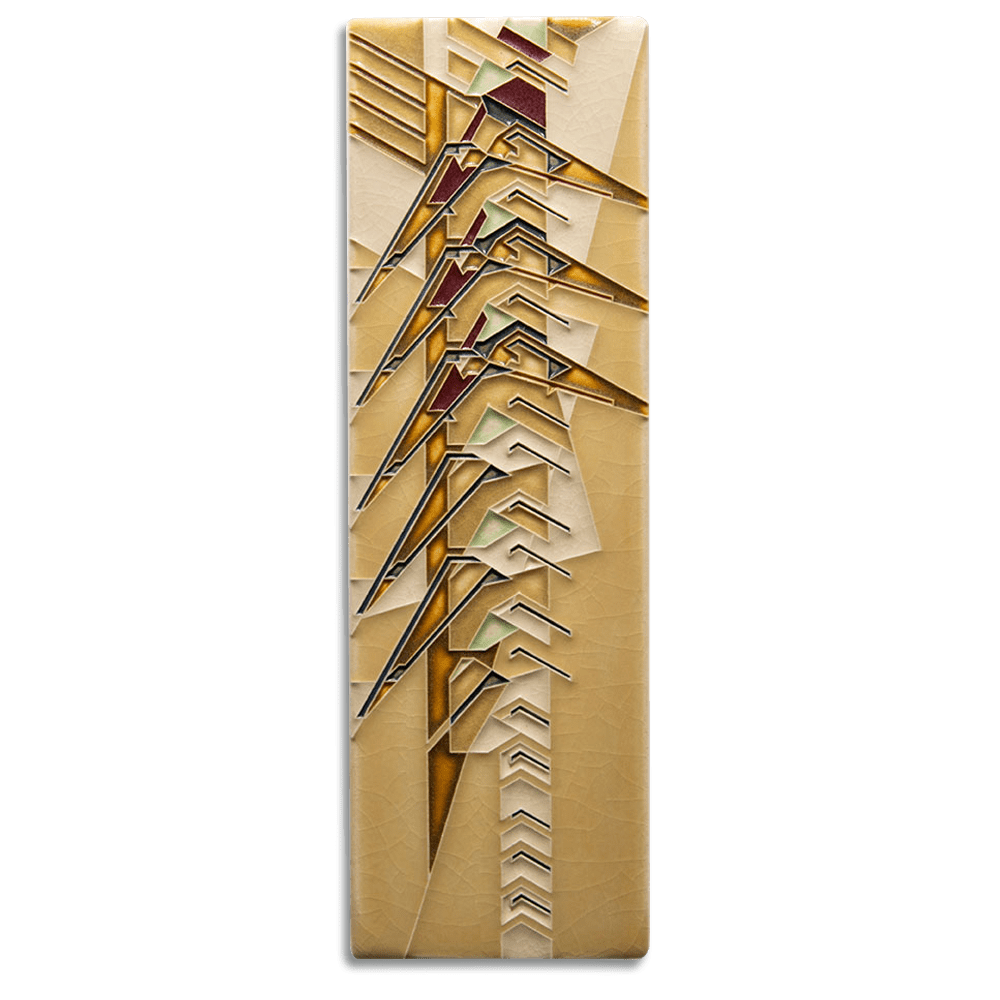 Wright’s John and Catherine Christian House, also known as Samara (named after a pinecone’s winged seeds), was completed in West Lafayette, Indiana, toward the end of his illustrious career. The samara seed pattern appears on Wright’s perforated board design for the house, and perhaps most prominently on a rug commissioned by Professor Christian in the 1990s and designed by Taliesin’s Aris Georges and Cornelia Brierly. That rug was the inspiration for Motawi Tileworks’ 4x12 Samara art tile, which reinterprets Wright’s pattern once again in ceramic.